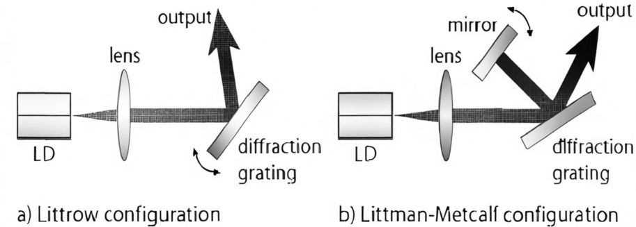 DFB மற்றும் DBR போன்ற குறுகிய-குழி பிரதான-குழி லேசர்கள் குறைந்த உள்-குழி ஃபோட்டான் தொடர்பு நேரத்தைக் கொண்டுள்ளன, இது ஆழமான வரி அகல சுருக்கத்தை கடினமாக்குகிறது. கோடு அகலத்தை மேலும் சுருக்கவும் மற்றும் சத்தத்தை அடக்கவும், இத்தகைய குறுகிய-குழி பிரதான-குழி கட்டமைப்புகள் பெரும்பாலும் செயல்திறன் மேம்படுத்தலுக்கான வெளிப்புற-குழி கட்டமைப்புகளுடன் இணைக்கப்படுகின்றன. பொதுவான வெளிப்புற-குழி கட்டமைப்புகளில் இடஞ்சார்ந்த வெளிப்புற துவாரங்கள், ஃபைபர் வெளிப்புற துவாரங்கள் மற்றும் அலை வழிகாட்டி வெளிப்புற குழிவுகள் ஆகியவை அடங்கும். ஃபைபர்-ஆப்டிக் சாதனங்கள் மற்றும் அலை வழிகாட்டி கட்டமைப்புகளின் வளர்ச்சிக்கு முன்பு, வெளிப்புற துவாரங்கள் முக்கியமாக தனித்த ஒளியியல் கூறுகளுடன் இணைந்து இடஞ்சார்ந்த ஒளியியலால் ஆனது. இவற்றில், கிராட்டிங் அடிப்படையிலான இடஞ்சார்ந்த வெளிப்புற-குழி பின்னூட்ட கட்டமைப்புகள் முக்கியமாக லிட்ரோ மற்றும் லிட்மேன் வடிவமைப்புகளை ஏற்றுக்கொள்கின்றன, பொதுவாக லேசர் ஆதாய குழி, இணைப்பு லென்ஸ்கள் மற்றும் ஒரு டிஃப்ராஃப்ரக்ஷன் கிராட்டிங் ஆகியவற்றைக் கொண்டிருக்கும். பின்னூட்ட உறுப்பாக, கிராட்டிங், அலைநீளம் டியூனிங், பயன்முறை தேர்வு மற்றும் வரி அகல சுருக்கத்தை செயல்படுத்துகிறது.
