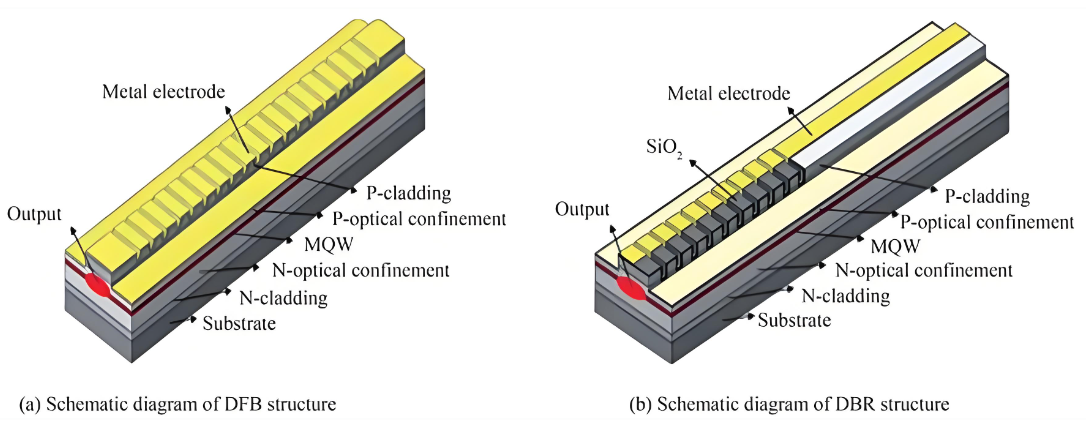 DFB லேசர்களின் தொழில்நுட்ப சவால் கிராட்டிங் கட்டமைப்புகளை உருவாக்குவதில் உள்ளது. டிபிஆர் செமிகண்டக்டர் லேசர்களில் கிராட்டிங் ஃபேப்ரிகேஷனுக்கு இரண்டு முதன்மை முறைகள் உள்ளன: இரண்டாம் நிலை எபிடாக்ஸி மற்றும் மேற்பரப்பு எச்சிங். Regrown grating feedback (RGF)-DFB செமிகண்டக்டர் லேசர்கள், செயலில் உள்ள பகுதியில் குறைந்த ஒளிவிலகல்-குறியீட்டு கிராட்டிங்க்களின் தொகுப்பை வளர்க்க இரண்டாம் நிலை எபிடாக்ஸி மற்றும் ஃபோட்டோலித்தோகிராஃபியைப் பயன்படுத்துகின்றன. இந்த முறை செயலில் உள்ள அடுக்கு கட்டமைப்பை குறைந்த இழப்புடன் பாதுகாக்கிறது, உயர்-கியூ ரெசனேட்டர்களை உருவாக்க உதவுகிறது. மேற்பரப்பு கிராட்டிங் (SG)-DFB செமிகண்டக்டர் லேசர்கள் செயலில் உள்ள பகுதியின் மேற்பரப்பில் ஒரு கிராட்டிங் லேயரை நேரடியாக பொறிப்பதை உள்ளடக்கியது. இந்த அணுகுமுறை மிகவும் சிக்கலானது, செயலில் உள்ள பகுதியின் பொருள் மற்றும் ஊக்கமருந்து அயனிகளுக்கு ஏற்ப துல்லியமான சரிசெய்தல் தேவைப்படுகிறது, மேலும் அதிக இழப்பை வெளிப்படுத்துகிறது, ஆனால் வலுவான ஆப்டிகல் கான்ஃபைன்மென்ட் மற்றும் அதிக பயன்முறை அடக்கும் திறனை வழங்குகிறது.